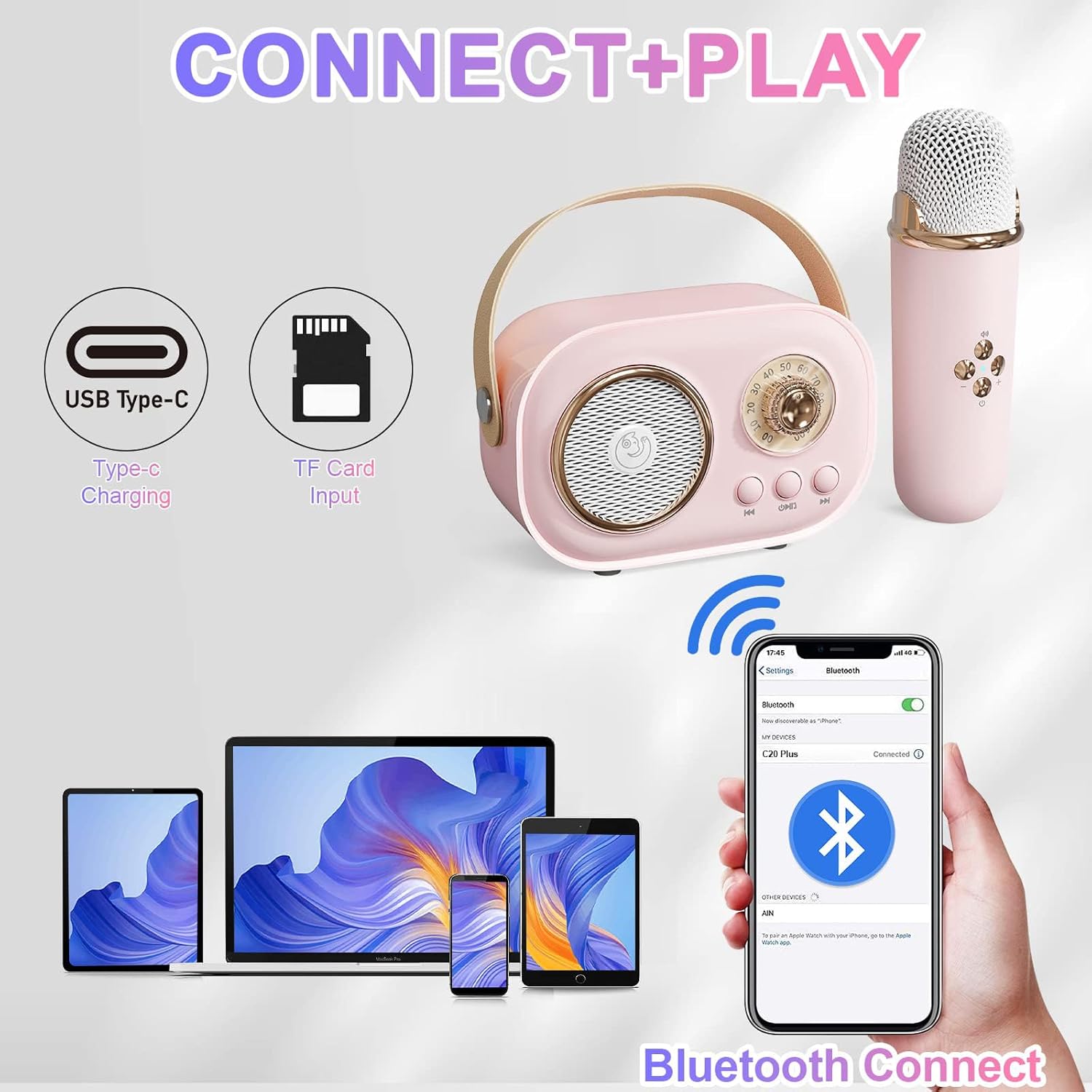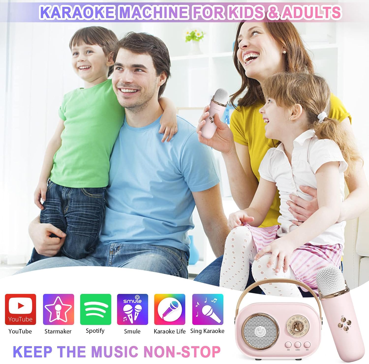 Pick up this cute karaoke machine and wireless microphone,enjoy your moving party! Mini KTV for music playing and singing at any time.No matter your skill level, our portable karaoke machine makes singing fun and easy. With intuitive controls and high-quality sound, you'll be able to belt out your favorite tunes like a pro in no time.For kids, teenagers, friends and adults, retro look with color are surprisingly awesome.
