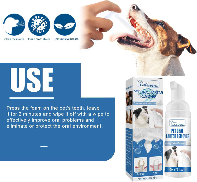 فوم پاک کننده تارتار حیوانات خانگی پیشرفته برای جرم های دندانی، دندان های زرد و بوی بد دهان – تمیز کننده موثر دندان برای سگ ها و گربه ها، 60 میلی لیتر، فرمول غیر تحریک کننده
