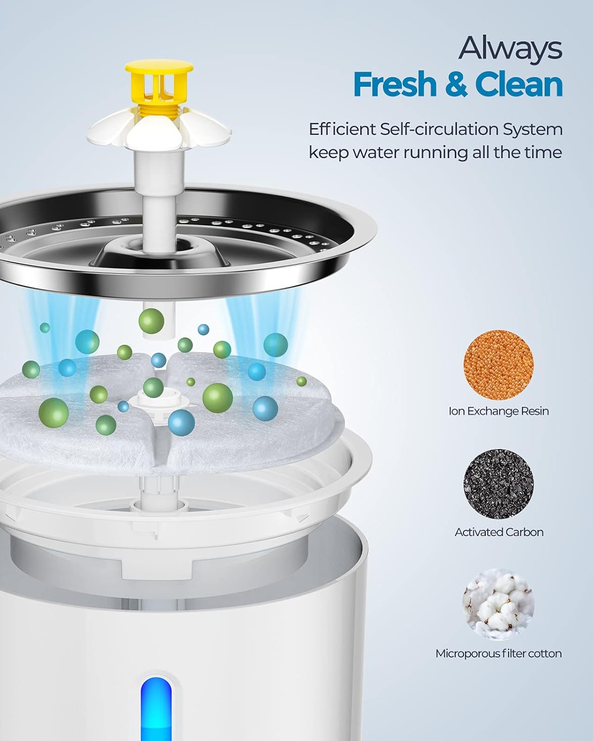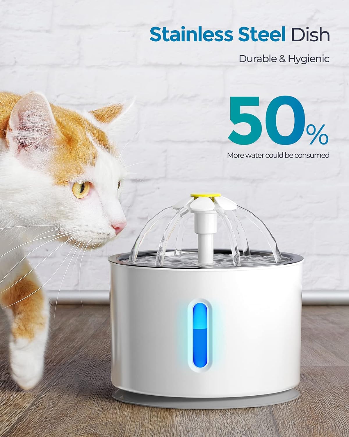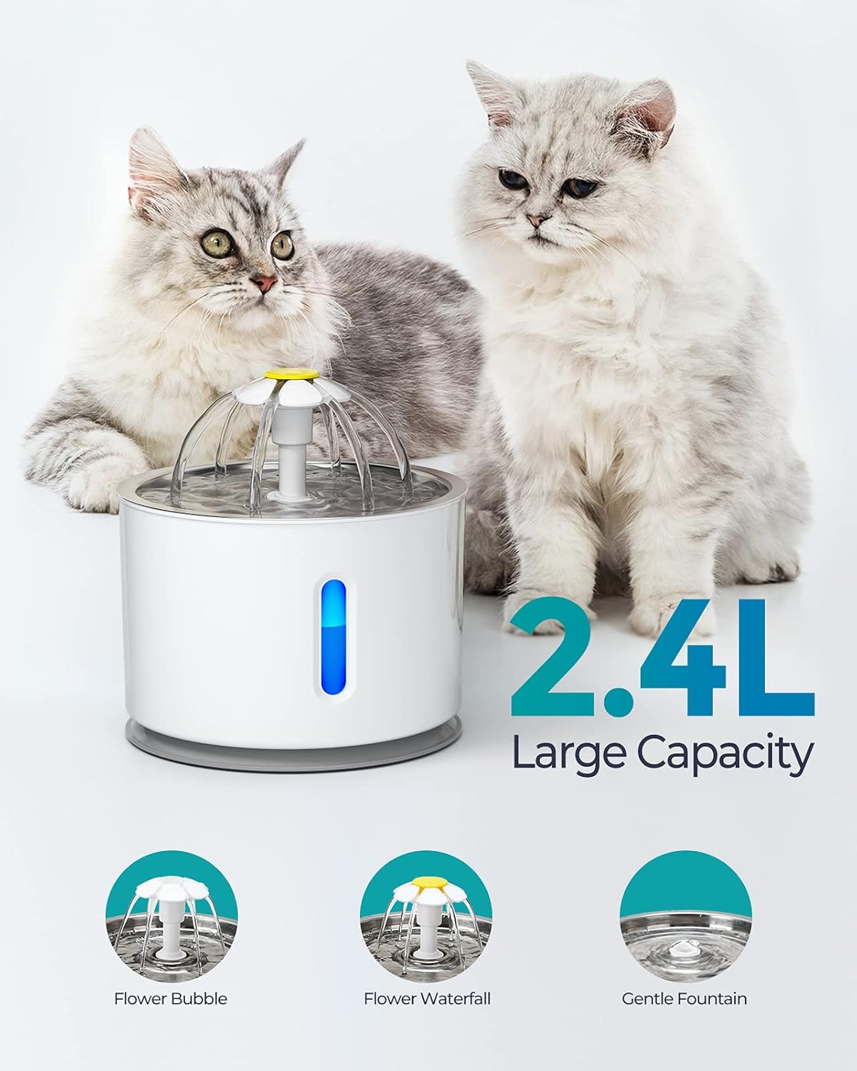 ظرفیت ۲.۴ لیتر: فواره گربه دارای ظرفیت ۲.۴ لیتر و سه حالت جریان، شامل آبشار، حباب و فواره ملایم است.