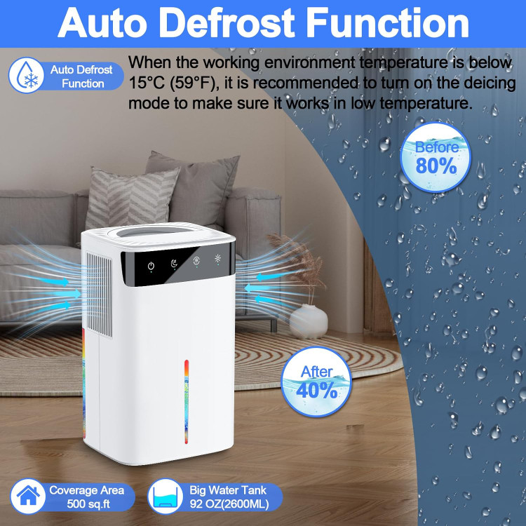 - Auto-Off Function:The visualized 92 OZ (2600ml) large water tank is easy to take out, clean. This portable dehumidifier will auto shut down when the water tank reaches full, the dehumidifier beeps and the RGB light flashes red.