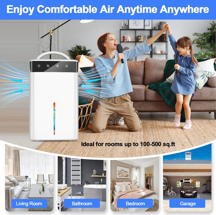 【صفحه لمسی و پرکاربرد】دستگاه رطوبتگیر قابل حمل ما به شما کمک میکند تا رطوبت اضافی هوا را در اتاق خوابها، اتاق نشیمن، کمد، آشپزخانه، RV، گاراژ و دفاتر از بین ببرید. با کنترل لمسی بصری ما، راحتی خود را افزایش داده و تجربه کاربری خود را بهبود بخشید. این دستگاه رطوبتگیر میتواند به طور موثر رطوبت هوا را کاهش دهد، به تصفیه هوا کمک کند، از دستگاه تنفسی محافظت کند و به سلامتی شما کمک کند. لطفاً ورودی هوا را در بالای دستگاه رطوبتگیر و خروجی هوا را در پشت آن بدون مانع نگه دارید.