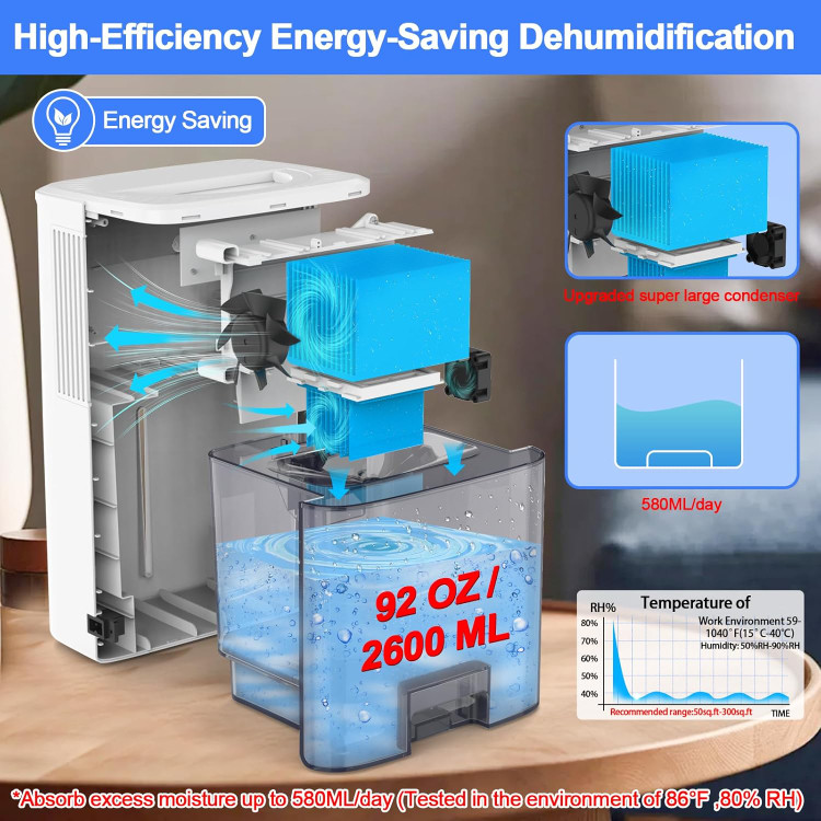 - High-Efficiency Dehumidification: Equipped with biger upgrade semiconductor condensation, this dehumidifier can remove up to 580ml of water daily at 86℉ and 80% RH. In addition, 36w rated power, high efficiency and energy saving dehumidification, effectively reducing indoor humidity to below 40%, creating a dry and comfortable environment