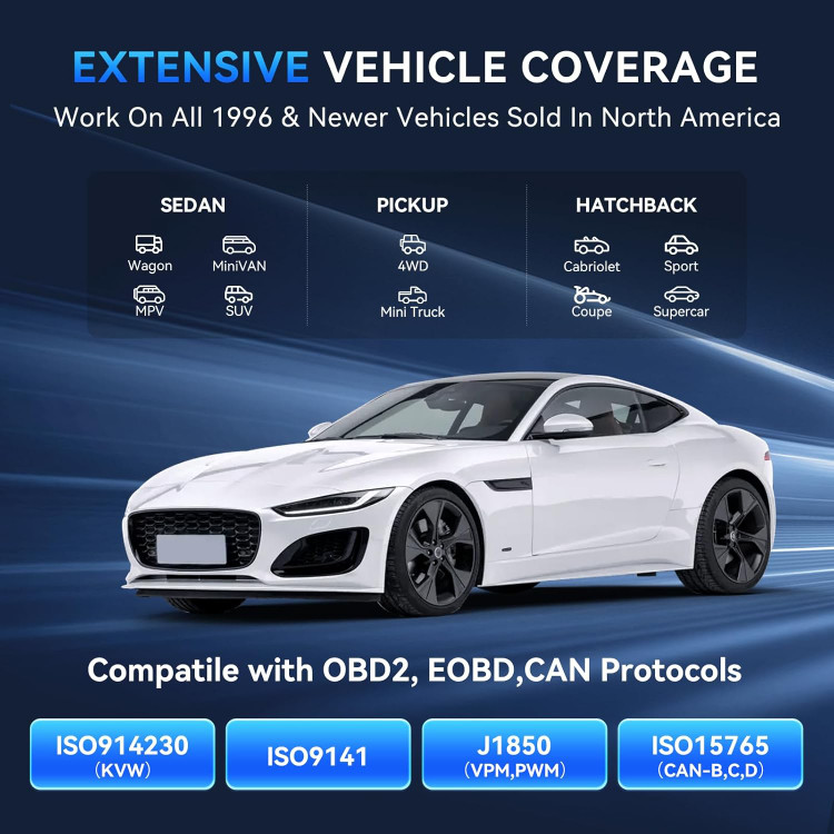 [سازگاری بینظیر] اسکنر Thinkobd500 برای خودرو روی اکثر خودروهای آمریکایی مدل ۱۹۹۶ و جدیدتر که با OBDII سازگار هستند (پروتکلهای OBDII: KWP2000، ISO9141، J1850 VPW، J1850 PWM و CAN) کار میکند. از جمله سدانهای ۱۲ ولتی، SUVها، کامیونهای سبک، مینی ونها، هیبریدیها و غیره. از زبانهای انگلیسی، فرانسوی، اسپانیایی، آلمانی، روسی، ایتالیایی، پرتغالی و لهستانی پشتیبانی میکند. [تست وضعیت آمادگی I/M با یک کلیک] میتوانید از اسکنر ماشین thinkobd500 برای بررسی وضعیت مانیتورهای مربوط به انتشار گازهای آلاینده، سیستم احتراق ناقص و سیستم سوخت استفاده کنید، قبل از استفاده از آن برای تست دود، مطمئن شوید که مانیتور تنظیم شده است، به شما کمک میکند تا به راحتی از تست دود اگزوز عبور کنید و در هزینه پرداخت جریمه صرفهجویی کنید.