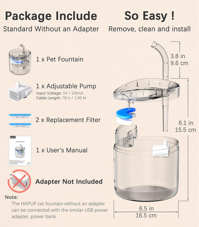 [پمپ فوق بیصدا قابل تنظیم] با سوئیچ جریان انتخابی ۳ حالته و ۳ فنجان مکش قوی سیلیکونی، پمپ فوق کمصدا و کممصرف DC5V متصل به USB میتواند به طور پایدار در کف آب فواره حیوانات خانگی قرار گیرد و جریان آب گربه را تنظیم کند. طول کابل برق پمپ ۷۸ اینچ / ۱.۹۸ متر (به جز سر پمپ) است. بدون آداپتور اضافی، پمپ آب فواره گربه دارای ساختار ساده و سریع رهاسازی است که به راحتی قابل جدا شدن، نصب و تمیز کردن است. یک رویای شیرین برای خود و حیوانات خانگیتان به جا بگذارید. [خدمات بدون ریسک] فواره آبخوری حیوانات خانگی HAPUP خدمات نگهداری ۱۲ ماهه ارائه میدهد. اگر پمپ شما در طول دوره نگهداری از کار افتاد، لطفاً برای تعویض با ما تماس بگیرید. لوازم جانبی اضافی نیز در فروشگاه ما موجود است. برای یافتن قطعات جایگزین، "فیلتر HAPUP" و "پمپ آب HAPUP" را جستجو کنید. در صورت بروز هرگونه مشکل در محصولات، لطفاً از طریق آمازون با پشتیبانی مشتری HAPUP تماس بگیرید.