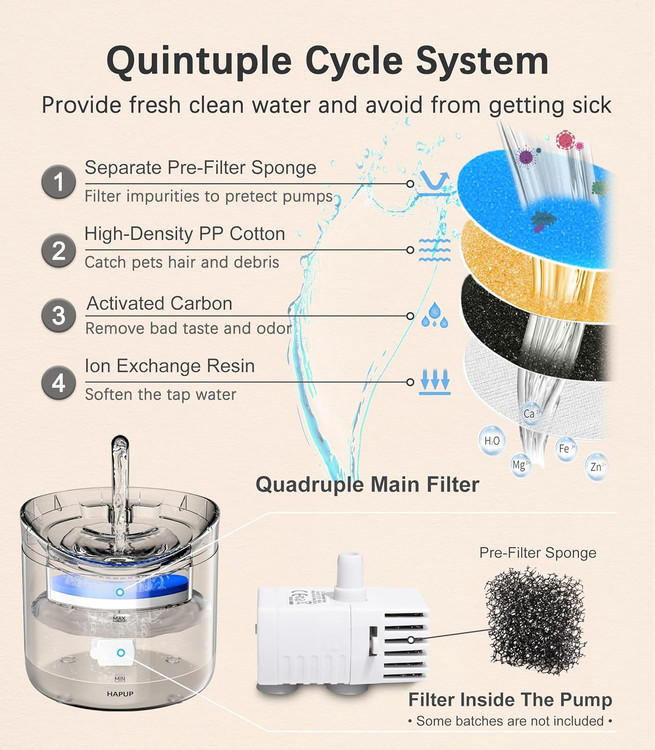 [ظرفیت طلایی و ظاهر ساده] مخزن آب فواره سگ HAPUP بدون هیچ برآمدگی اضافی میتواند 1.8 لیتر / 61 اونس آب را در خود جای دهد و به راحتی توسط کیتهای برس تمیز کننده تمیز شود. فواره آب برای گربهها برای خانوادههای مختلف حیوانات خانگی مناسب است. نیازی به پر کردن مکرر آب نیست، آب ذخیره شده میتواند به مدت یک هفته دوام بیاورد. بنابراین، میتوانید بدون هیچ نگرانی برای چند روز بیرون بروید. کاسه آب فواره گربه 120 میلیلیتری / 4 اونسی، در صورت قطع برق، آب آشامیدنی یک روزه گربهها را فراهم میکند. [سیستم چرخه پنجگانه] با ۲ فیلتر جایگزین آبی اضافی، کاسه ذخیره آب فواره گربه از یک سوراخ تخلیه توخالی کم ارتفاع کاسه آب بالایی برای تشکیل سیستم ۵ چرخه استفاده میکند که ذرات درشتتر را به فیلتر ۴ لایه هدایت میکند. اسفنج پیشفیلتر آبی ناخالصیهای بزرگ را فیلتر میکند. پنبه PP سفید میتواند موی گربه و زبالههای ریز را در دستگاه پخش آب حیوانات خانگی بگیرد، لایه رزین تبادل یونی میتواند آب شیر را نرم کند، لایه کربن فعال میتواند طعم و بوی بد را از بین ببرد.