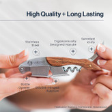 ارگونومیک - دسته چوبی براق و بدنه استیل ضد زنگ بادوام، به این درب بازکن بطری شراب، استحکام و اطمینان خاطر میدهد. باز کردن چوب پنبه را به راحتی با ۱، ۲، ۳ بار انجام میدهد!