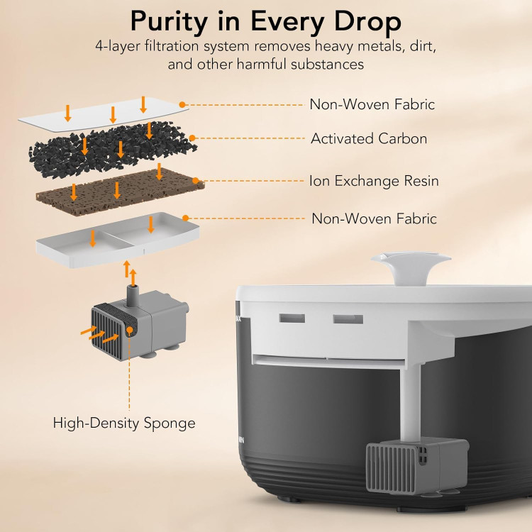【فیلتراسیون پیشرفته 5 مرحلهای】 فواره ما دارای یک سیستم فیلتراسیون 5 مرحلهای با مواد ارتقا یافته، از جمله رزین تبادل لون و کربن فعال است. این ترکیب تضمین میکند که حیوان خانگی شما تا ۴ هفته آب تازه و خالص داشته باشد.