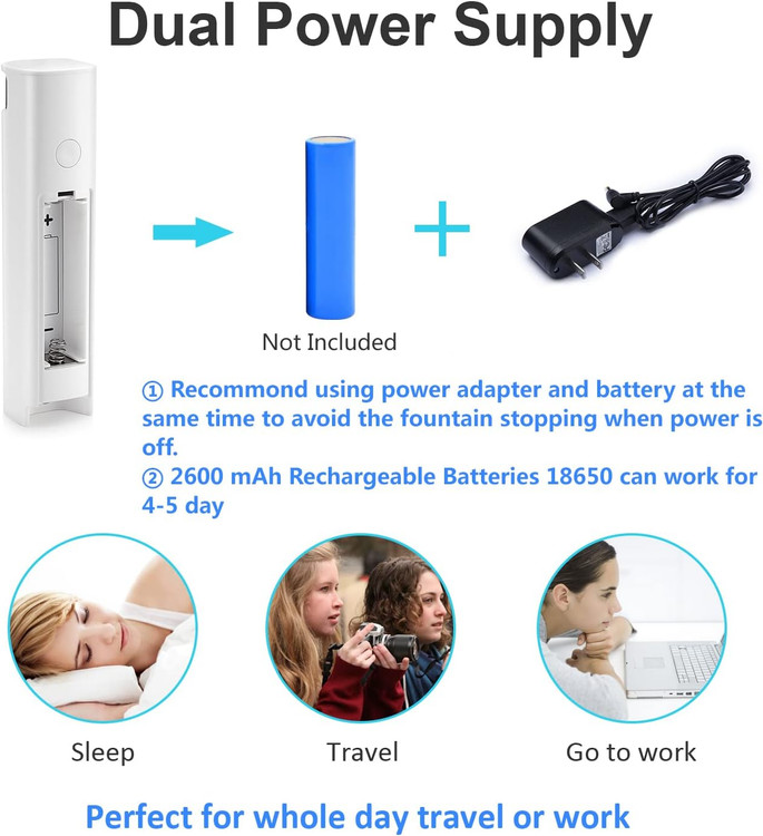 این آبخوری هوشمند از آداپتور DC و همچنین باتریهای لیتیوم یونی (شامل نمیشود) پشتیبانی میکند. در صورت تمایل، باتریهای مناسب را میتوانید از آمازون تهیه کنید. این قابلیت دوگانه، انعطافپذیری بالایی برای استفاده در هر محیطی فراهم میکند.