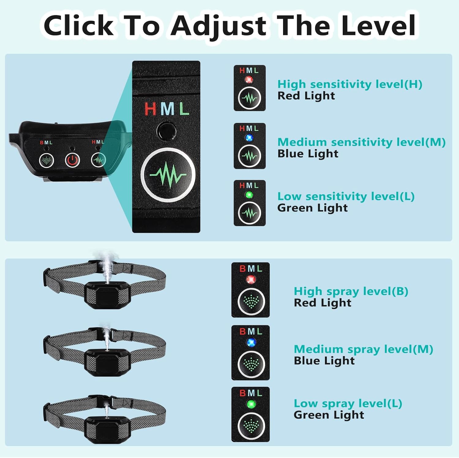 【حساسیت و میزان پاشش قابل تنظیم】 این قلاده ضد پارس سگ دارای ۳ سطح حساسیت و ۳ سطح پاشش است. میتوانید با فشار دادن دکمه میزان پاشش، میزان پاشش را کم یا زیاد و با فشار دادن دکمه حساسیت، میزان حساسیت را کم یا زیاد کنید. با تنظیم آن، میتوانید برنامهای را که کاملاً با سگ شما متناسب است، تنظیم کنید!