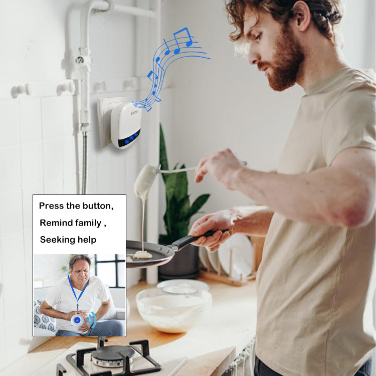 ۴. راهاندازی آسان: اگر به کمک نیاز دارید، فقط دکمه تماس را فشار دهید و گیرنده دوشاخهدار صدای بلندی را برای درخواست کمک از مراقب به موقع منتشر میکند. دکمه تماس فرستنده مجهز به یک طناب آویز است که میتواند دور گردن آویزان شود، در کیف قرار گیرد یا به میز کنار تخت یا حمام متصل شود و حمل آن را آسان کند.