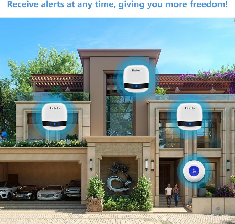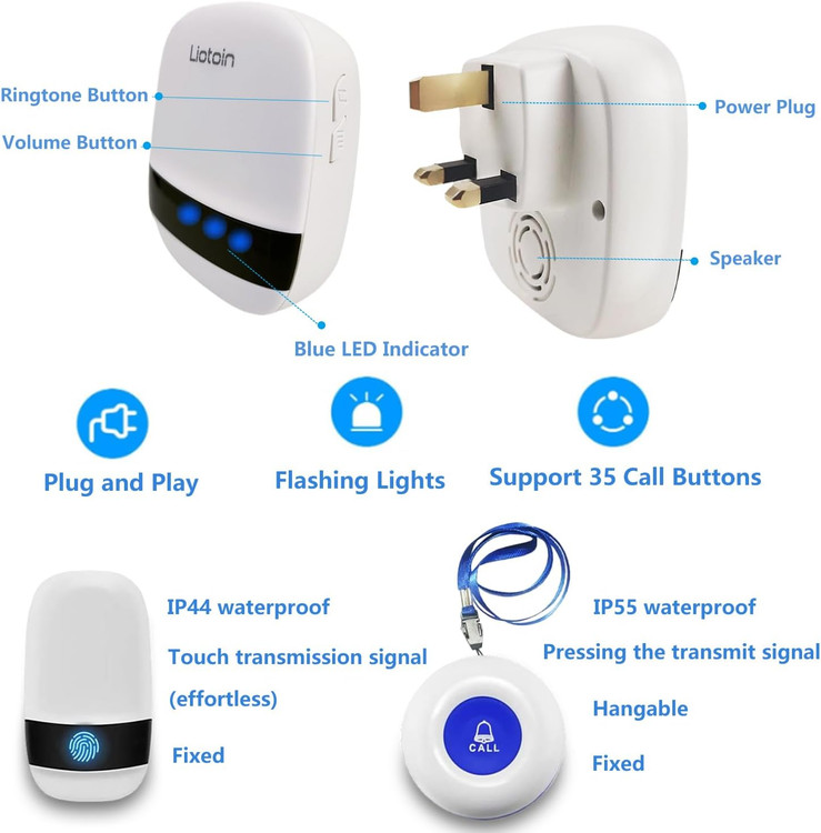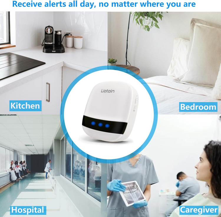 زنگ هشدار سالمندان دکمه تماس هشدار سالمندان بی سیم LIOTOIN، زنگ هشدار شخصی برای سیستم تماس سالمندان/بیمار/پرستار (۳ فرستنده ضد آب، ۱ گیرنده پلاگین)