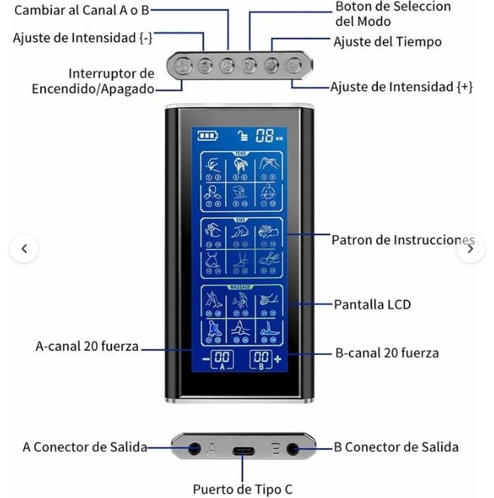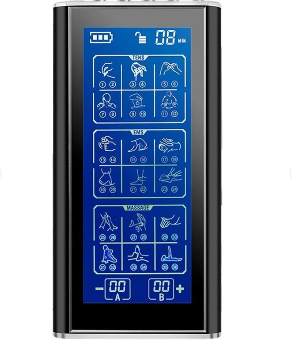 A/B Dual Channels TENS: میتوانید حالتها و شدتهای جداگانهای را برای کانال A و کانال B به طور همزمان تنظیم کنید، همچنین میتوانید به شما اجازه استفاده از آن را با خانواده یا دوستانتان در کنار هم بدهید. فناوری شبیهسازی بدن انسان و کنترل هوشمند میکروکامپیوتری، کانالهای دوگانه مستقل که ۱۰ پد واحد TENS (الکترود) را کنترل میکنند تا به تحریک عضلات و تسکین درد کمر، مفاصل، گردن، زانو، شانهها، مچ پا، پاها، مچ دست و آرنج و غیره کمک کنند.دو حالت TENS و EMS بر روی یک دستگاه TENS متمرکز شده اند تا از سلامت شما محافظت کنند. تحریک الکتریکی عصب از راه پوست (TENS) حالت تسکین درد: TENS یک روش غیرتهاجمی و بدون دارو برای کنترل درد است. TENS از تکانه های الکتریکی کوچکی استفاده می کند که از طریق پوست به اعصاب ارسال می شود تا درک درد شما را اصلاح کند. در اکثر بیماران، در کاهش یا از بین بردن درد موثر است و امکان بازگشت به فعالیت عادی را فراهم می کند. یک مسکن بی خطر که توسط فیزیوتراپیست ها استفاده می شود و توسط پزشکان برای بیش از ۳۰ سال تجویز می شود. تحریک الکتریکی عضلات (EMS)حالت تهویه عضلات: EMS یک روش جهانی پذیرفته شده و اثبات شده برای درمان آسیب های عضلانی است. با ارسال پالس های الکترونیکی به عضله ای که نیاز به درمان دارد کار می کند. این باعث می شود که ماهیچه به صورت غیر فعال ورزش کند. این به طور گسترده ای در بیمارستان ها و کلینیک های ورزشی برای درمان آسیب های عضلانی و برای آموزش مجدد عضلات فلج، برای جلوگیری از آتروفی در عضلات آسیب دیده و بهبود تون عضلانی و گردش خون استفاده می شود.