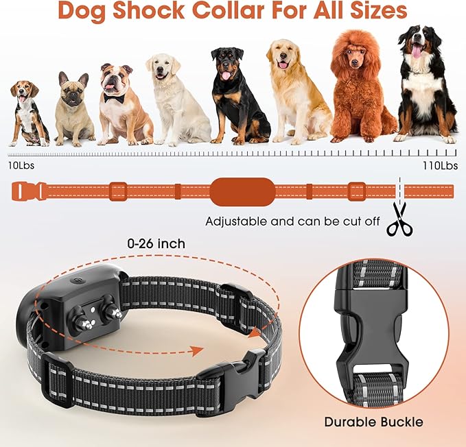 قلاده شوک سگ برای همه اندازهها: بند قلاده الکترونیکی قابل تنظیم است، مناسب برای سگهای کوچک/متوسط/بزرگ (۱۰ پوند تا ۱۱۰ پوند)، اندازه گردن ۸ تا ۲۴.۴ اینچ.