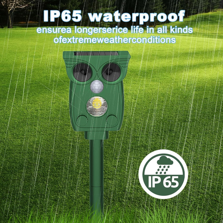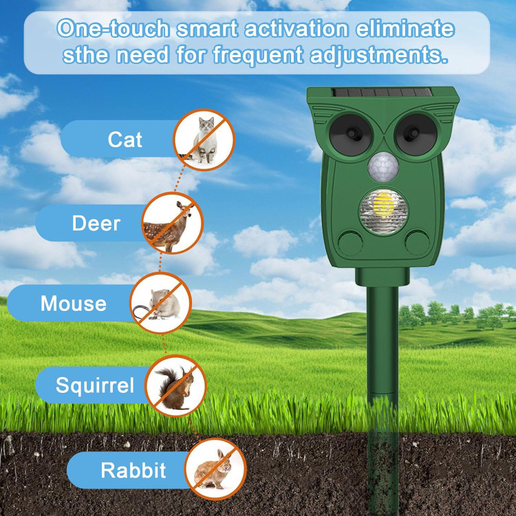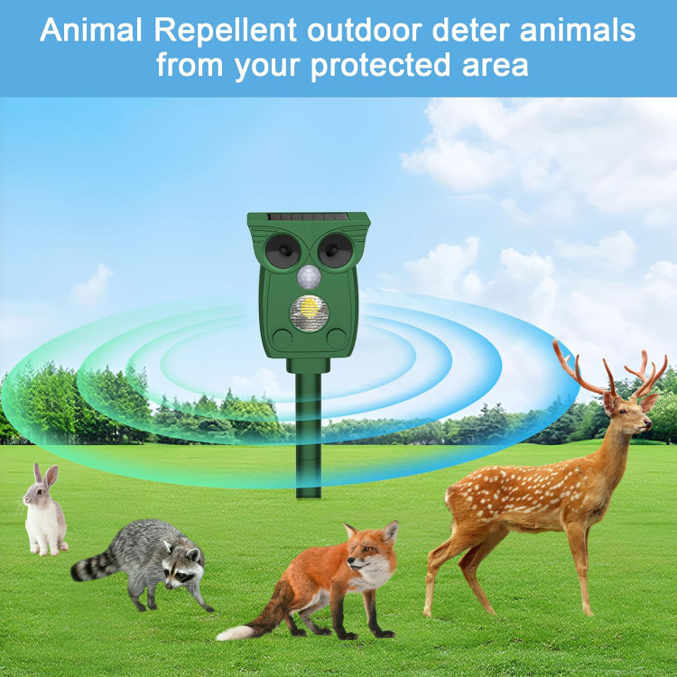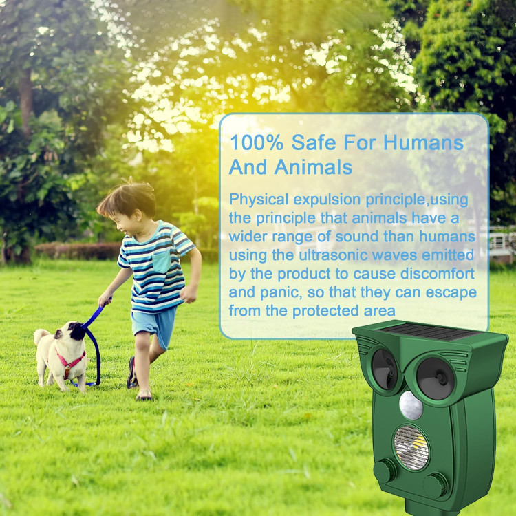 موثر و دور کردن حیوانات - دفعکننده اولتراسونیک حیوانات دارای یک سیستم تشخیص حرکت داخلی است که میتواند حرکت را تشخیص داده و امواج فراصوت قدرتمندی ارسال کند که باعث میشود راندن حیوانات به صورت انسانی برای حیوانات ناراحتکننده باشد، اما هیچ آسیبی به بدن انسان وارد نمیکند. بدون تله، بدون حیوان مرده.