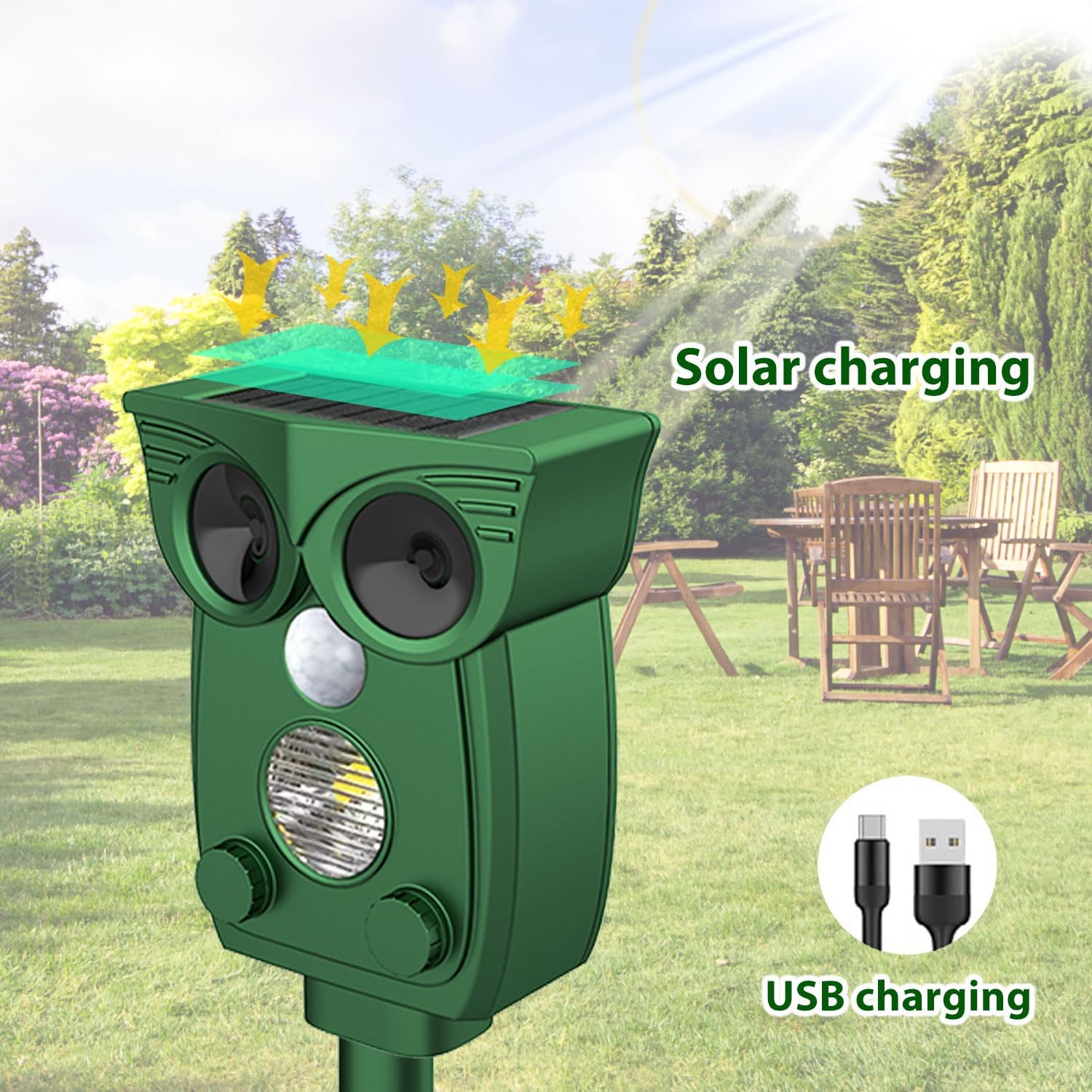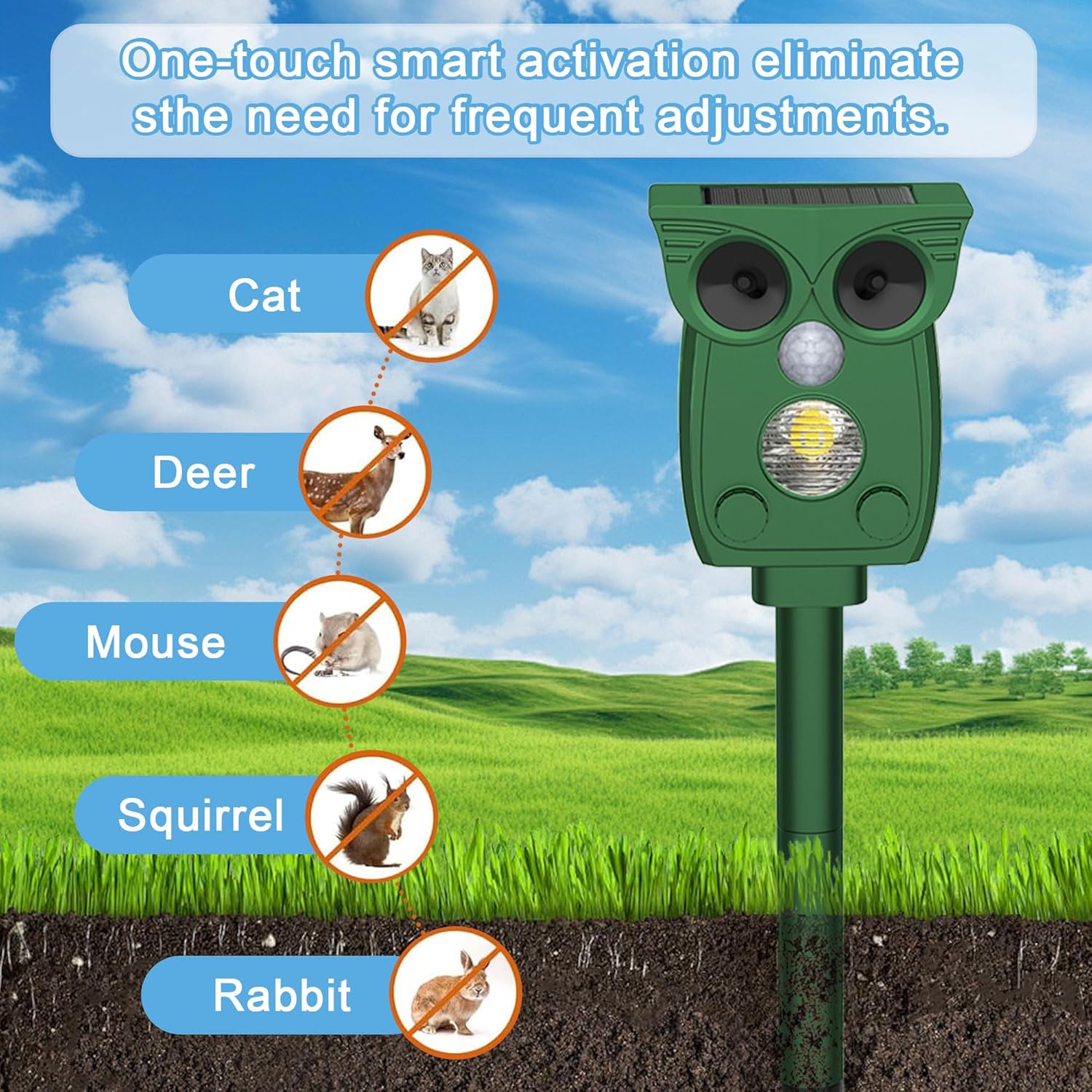 موثر و دور کردن حیوانات - دفعکننده اولتراسونیک حیوانات دارای یک سیستم تشخیص حرکت داخلی است که میتواند حرکت را تشخیص داده و امواج فراصوت قدرتمندی ارسال کند که باعث میشود راندن حیوانات به صورت انسانی برای حیوانات ناراحتکننده باشد، اما هیچ آسیبی به بدن انسان وارد نمیکند. بدون تله، بدون حیوان مرده.